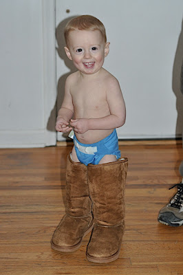 Yesterday Jared was getting ready to go drop off Valentine's for the big kids who were at their mom's house. When Asher saw him heading for the door, he decided he was going to leave too. His plan? Wear Olivia's boots. He tried putting them on himself but of course couldn't quite do it alone, so Daddy assisted. Asher thought it was so great. He even walked around in them which I was impressed by. Is it possible that this kid just keeps getting funnier and more entertaining every day? He has the most darling little personality. We can't gush about him enough.